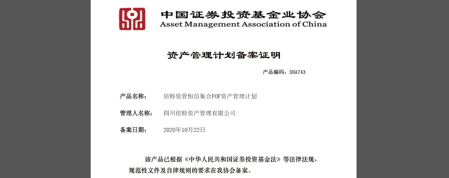 2020年10月21日,倍特期貨有限公司(以下簡(jiǎn)稱(chēng)“倍特期貨”)資產(chǎn)管理子公司——四川倍特資產(chǎn)管理有限公司(以下簡(jiǎn)稱(chēng)“倍特資管”)發(fā)起設立的資產(chǎn)配置策略私募FOF產(chǎn)品“倍特資管恒信集合FOF資產(chǎn)管理計劃”成立,并于10月22日通過(guò)中國證券投資基金業(yè)協(xié)會(huì )備案。瀏覽 : 8772分享
